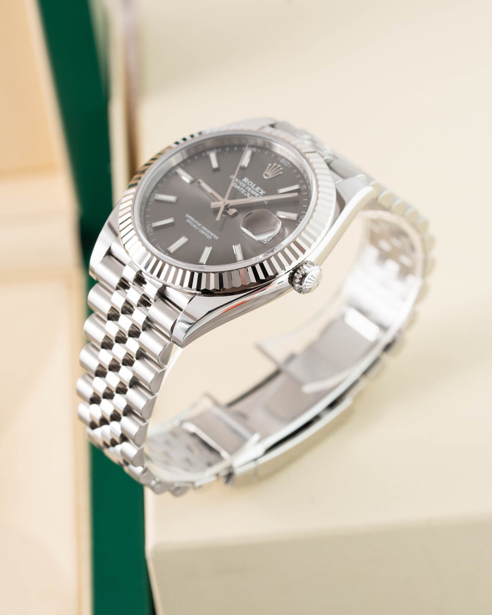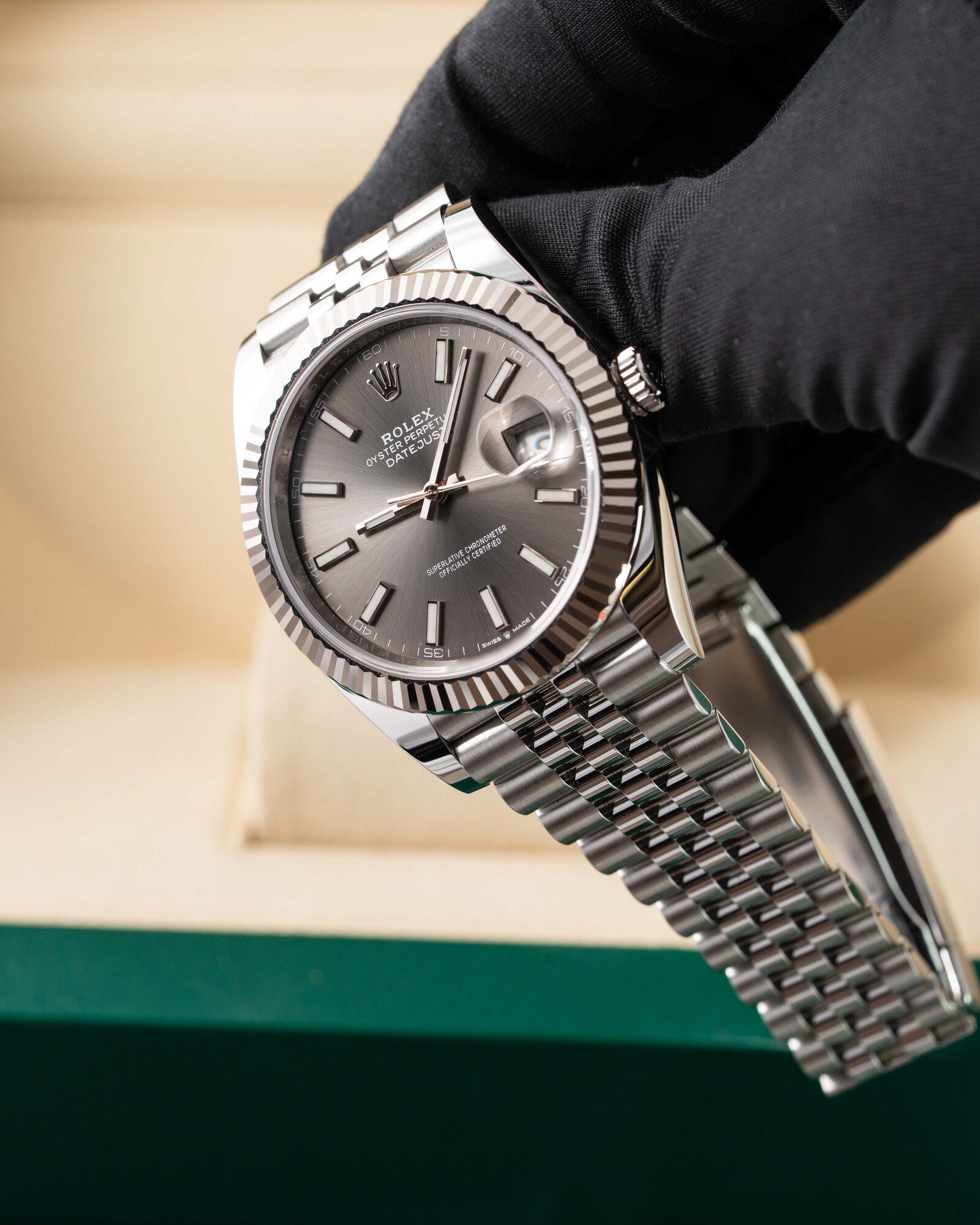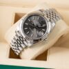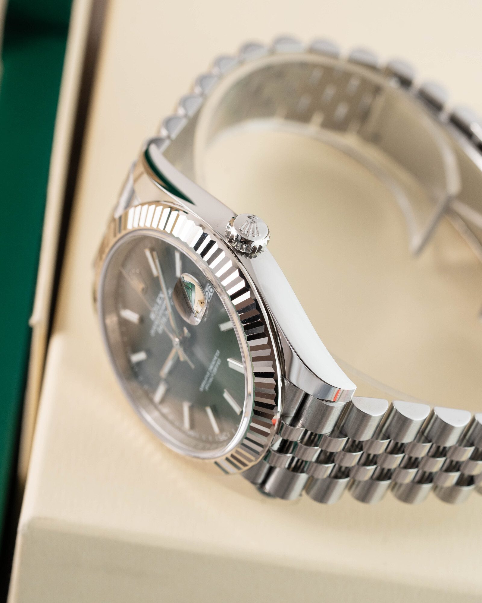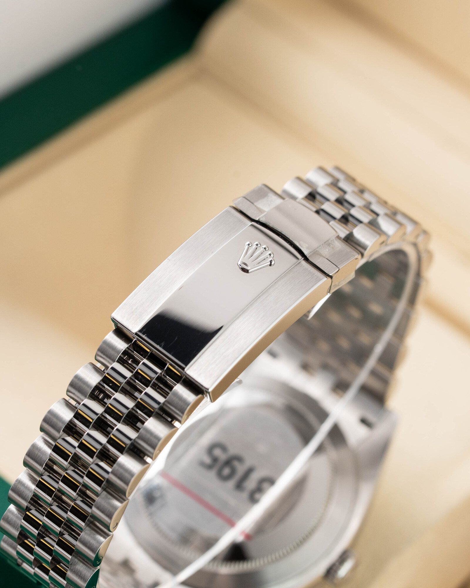 One of the cleanest, most eye-catching Datejusts out there. The 41mm stainless steel case, paired with that sleek rhodium dial, sits perfectly on the iconic Jubilee bracelet, finished with a fluted white gold bezel… it’s pure class ✨