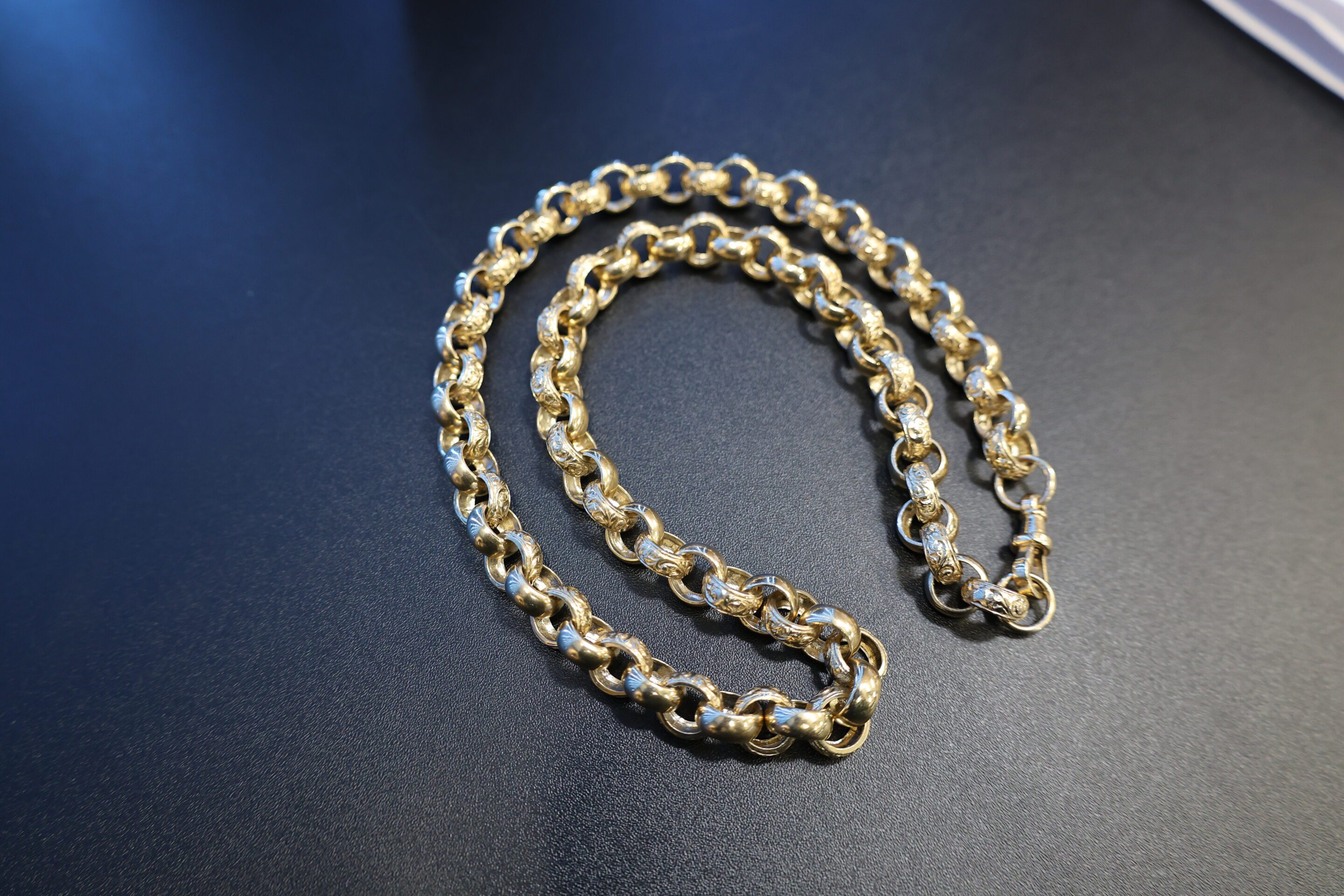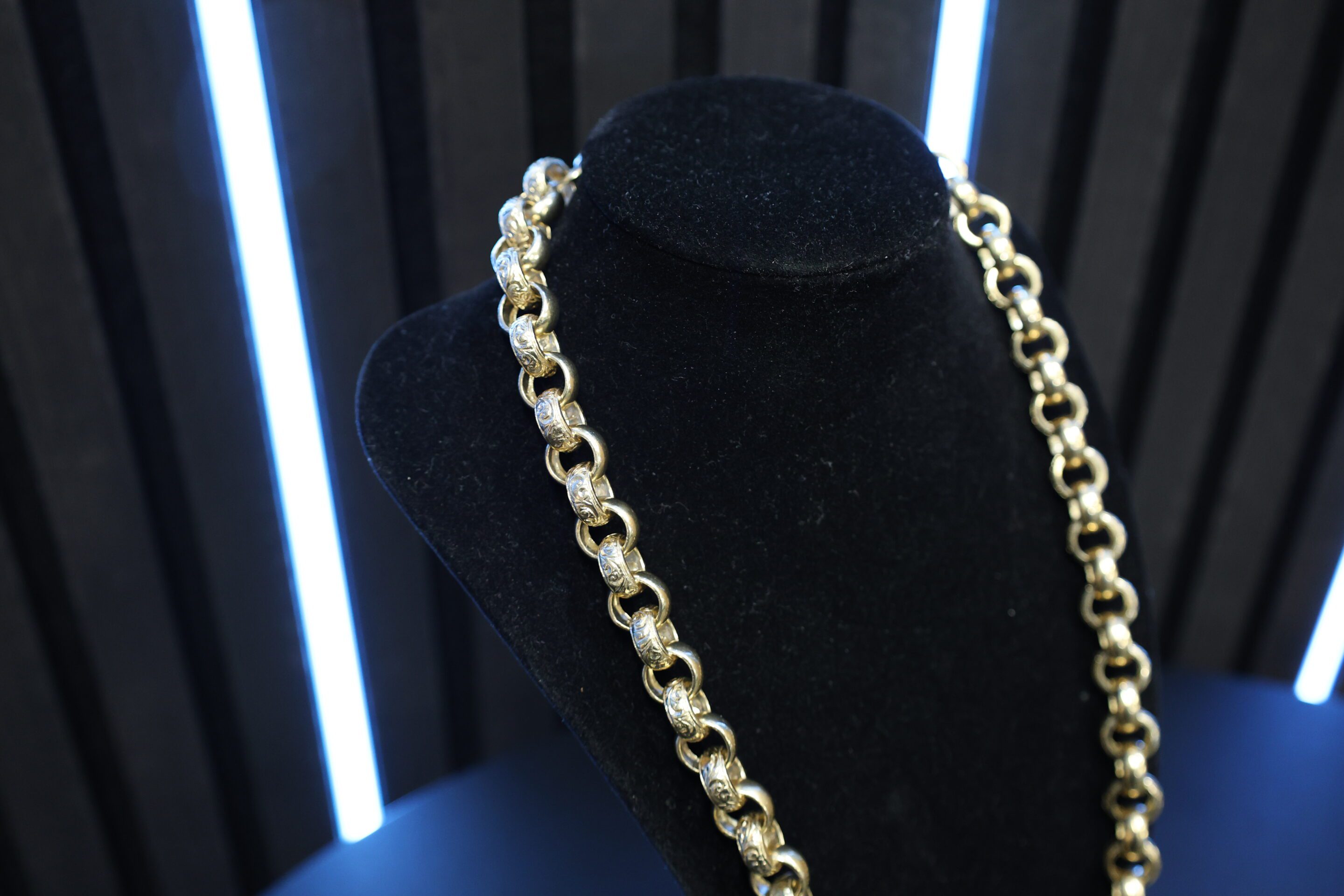 GOOOOOOOOOLD! It’s just beautiful stuff, isn’t it, and with the ever-increasing prices, it’s worth a fortune too. Here we have a 9ct Gold Belcher Chain measuring 24″ in length and weighing 119 grams!
