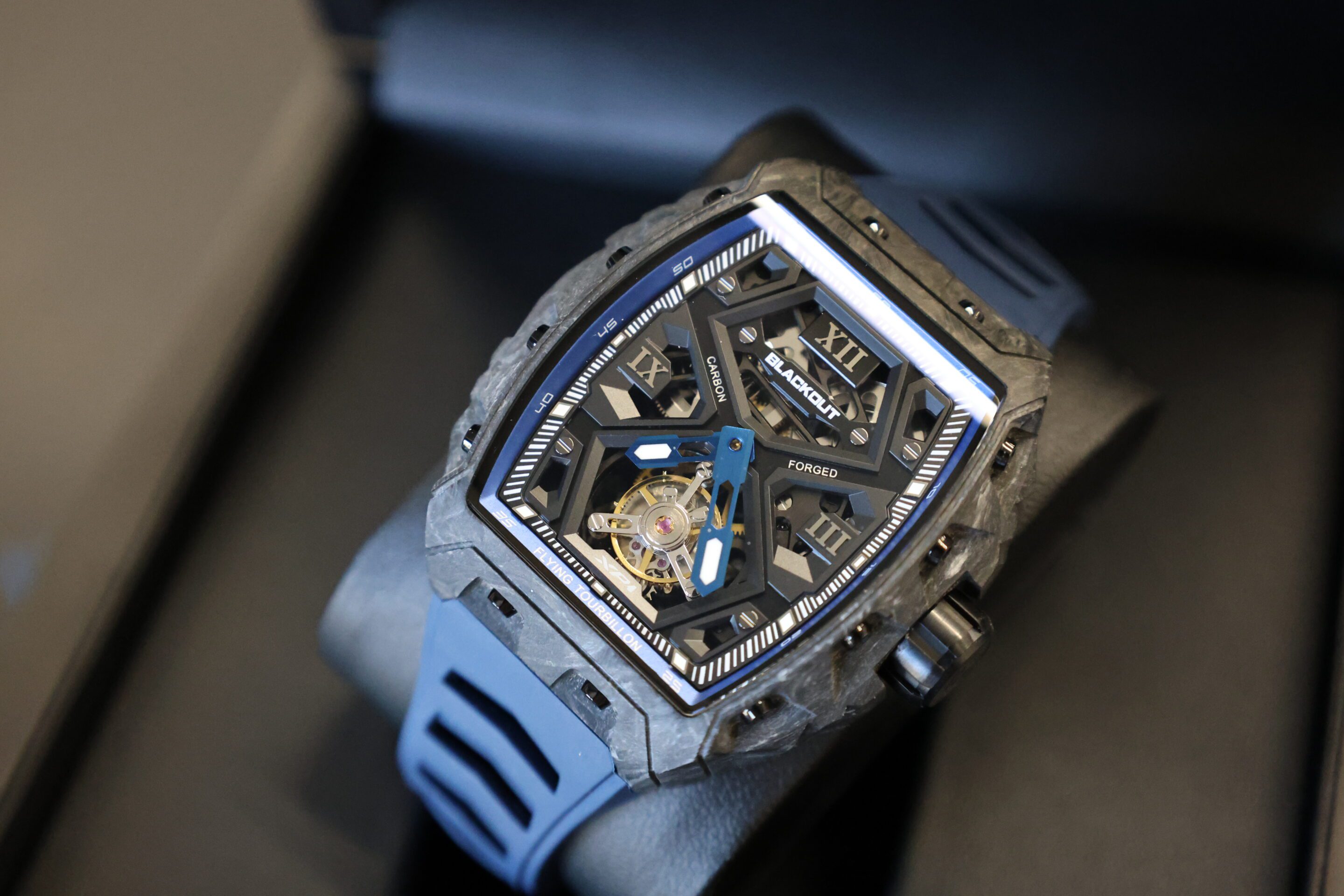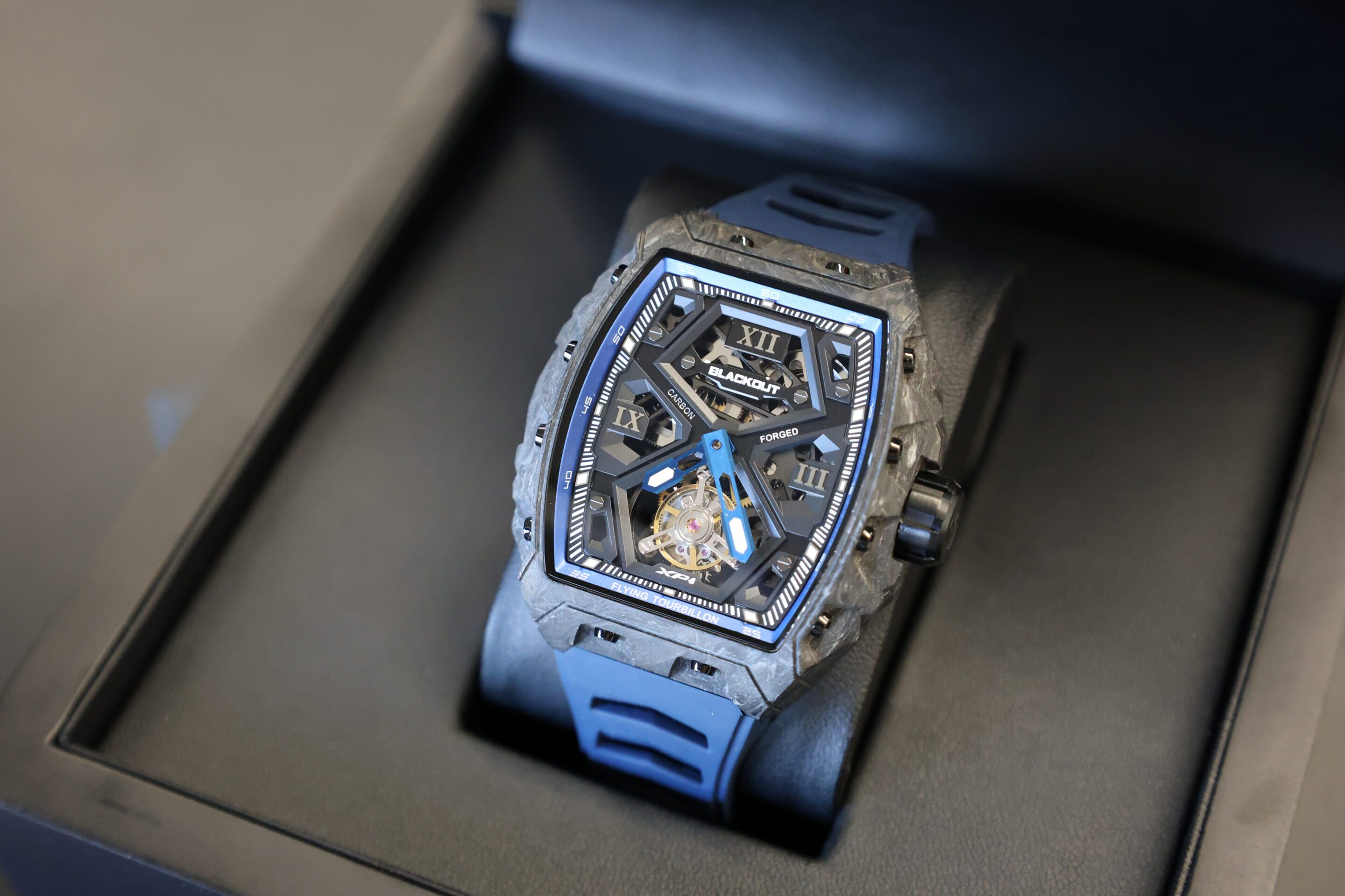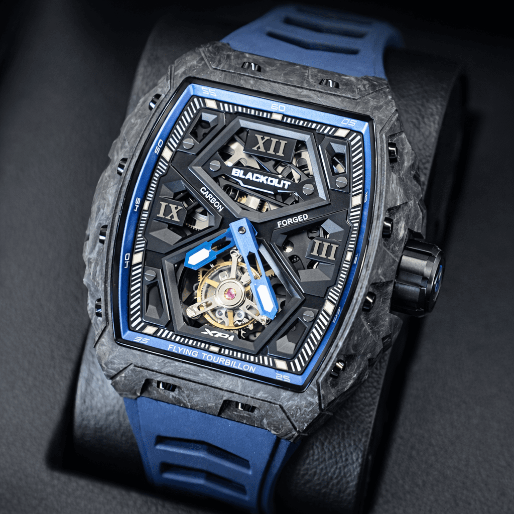This is an absolute standout timepiece. The Blackout XP1 Tourbillon features a striking forged carbon fibre case with bold blue accents—giving it a premium, modern look that feels just as good on the wrist as it looks.