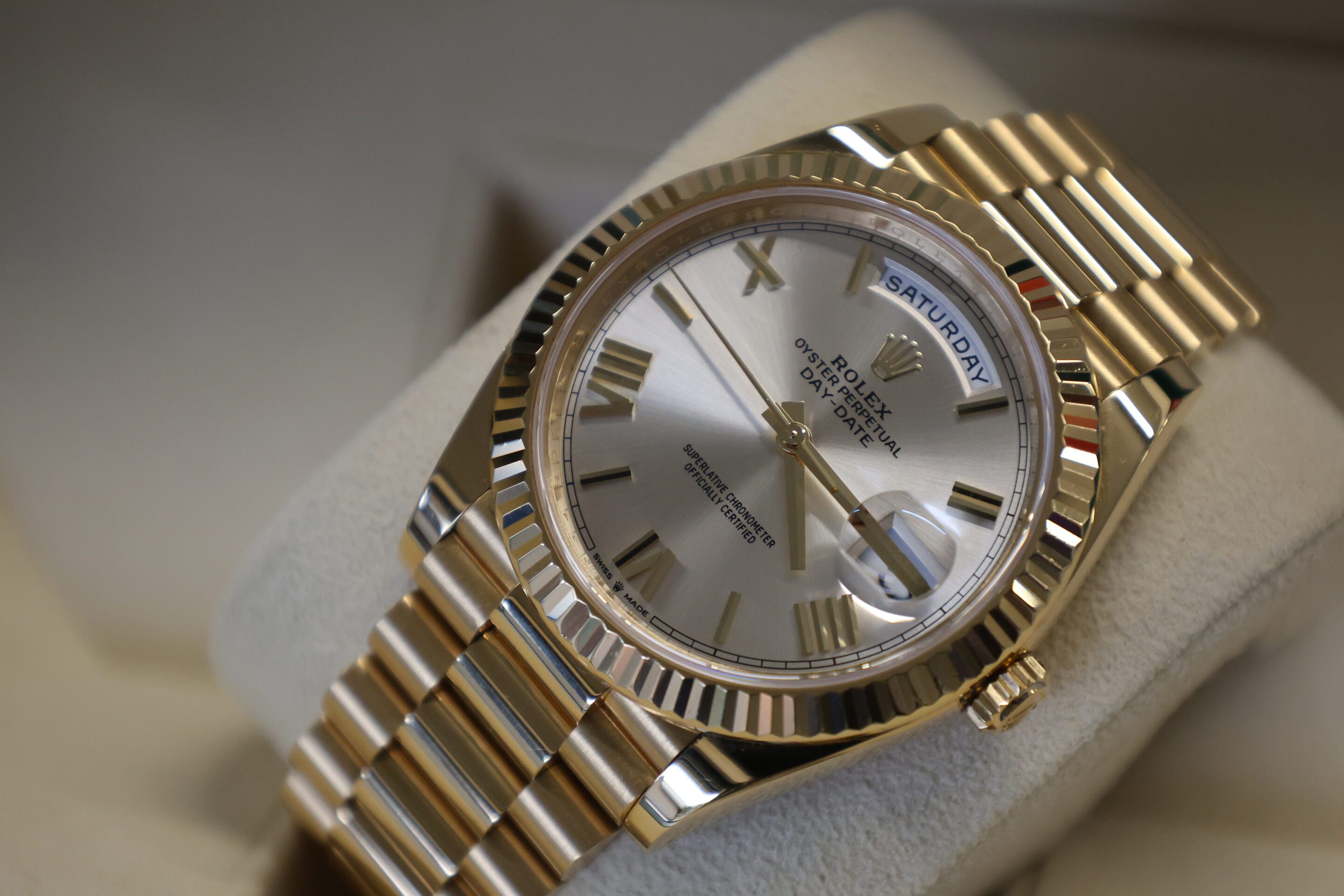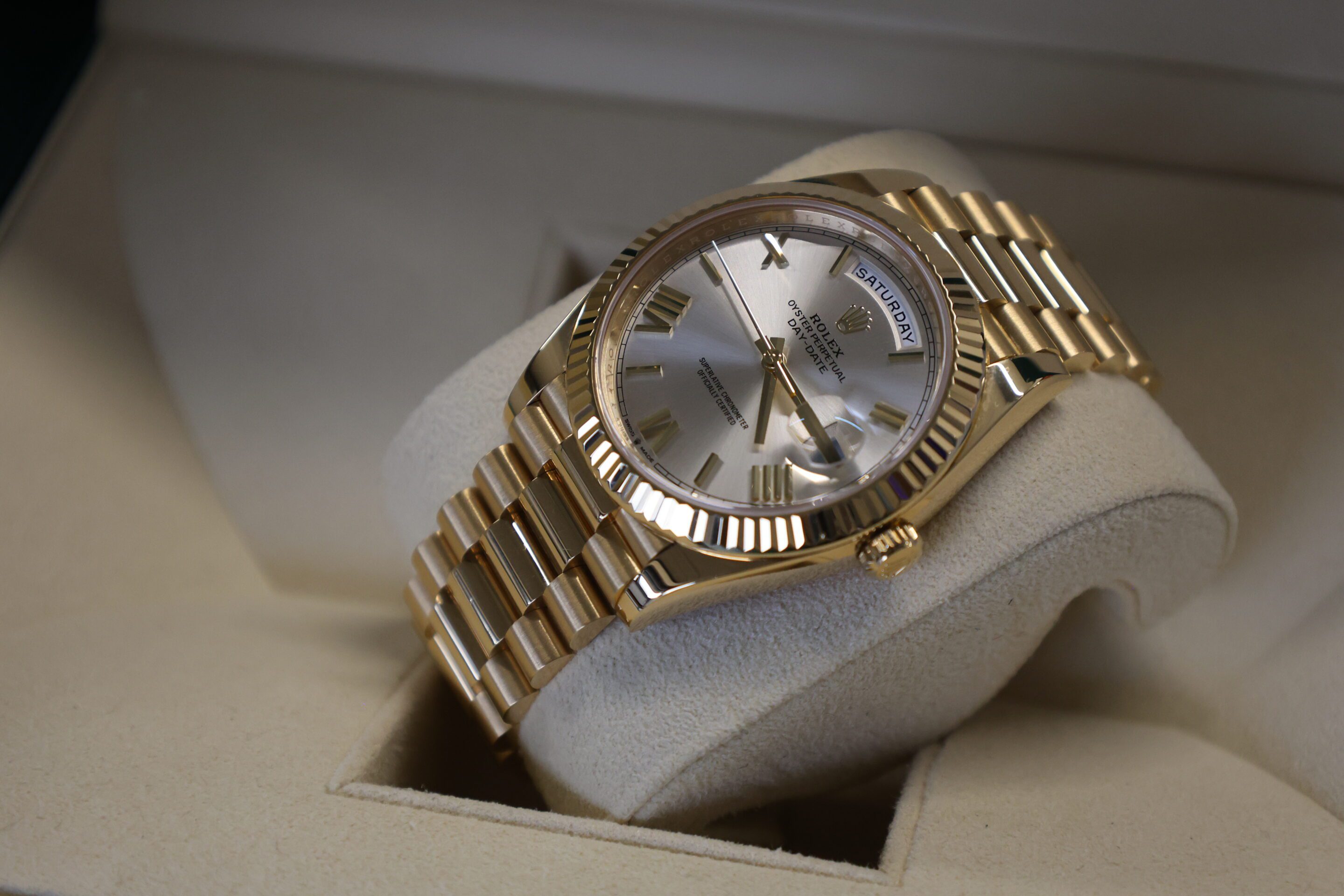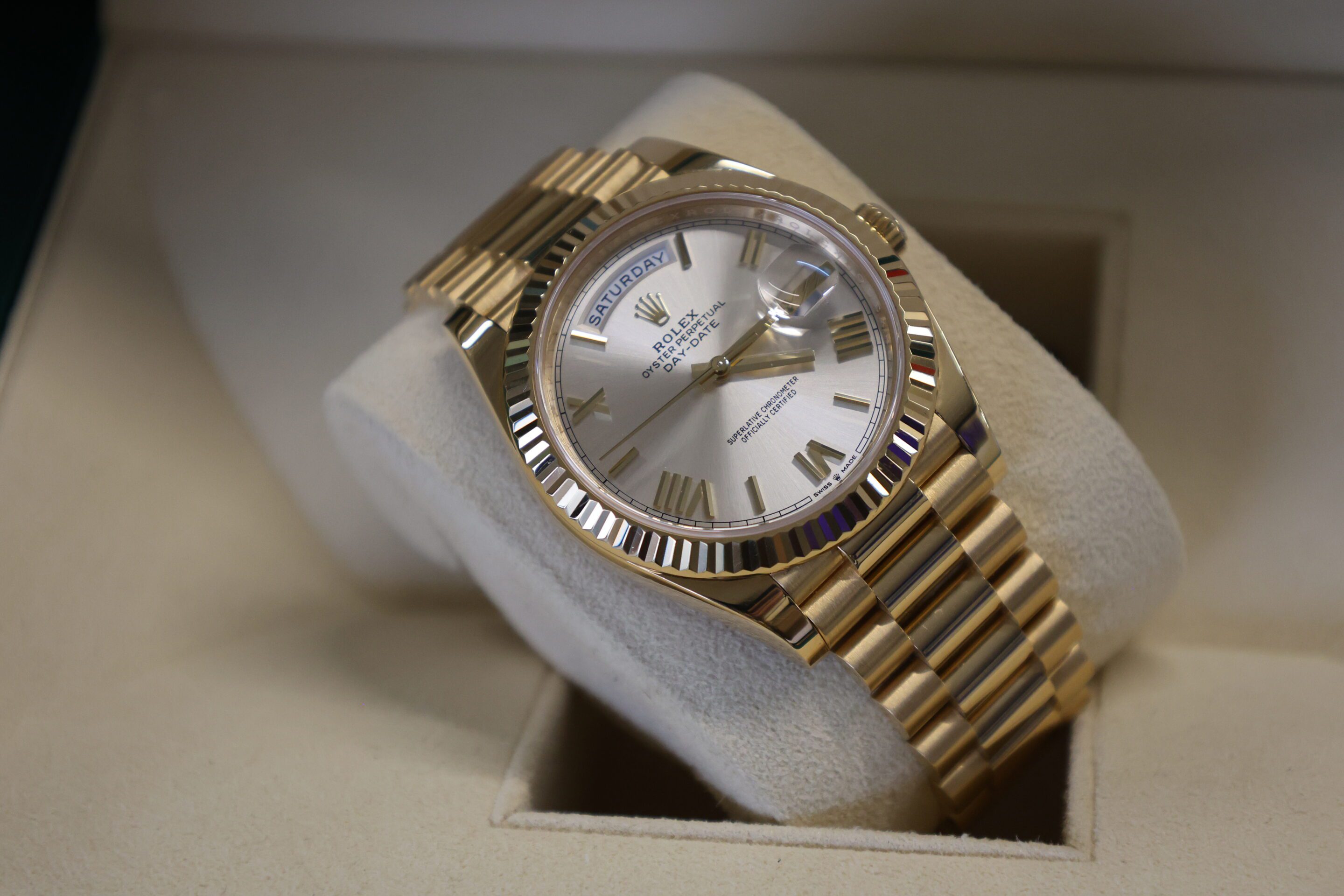 NOW THIS IS A WATCH! SOLID YELLOW GOLD DAY-DATE 40 WITH THE STUNNING SILVER DIAL. RRP £43,100