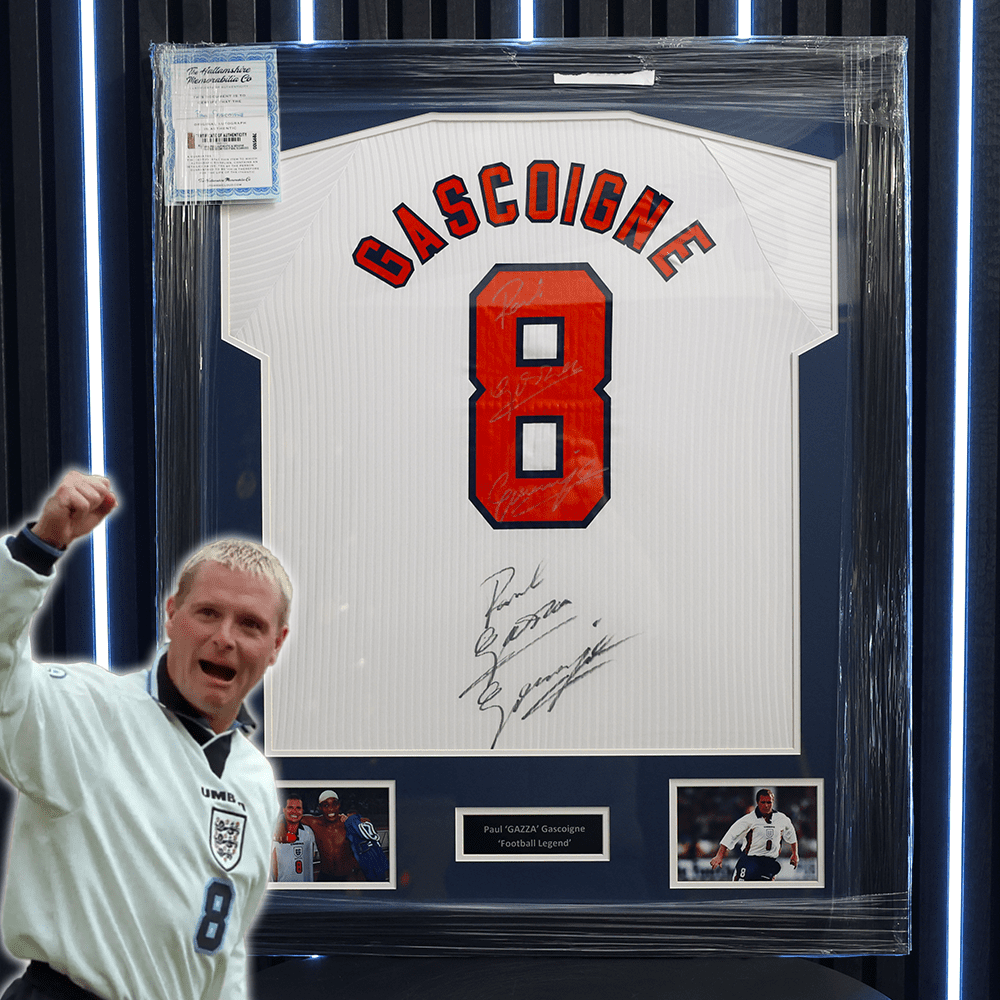 Here we have a framed and signed England shirt by one of the best and most memorable players ever, Paul Gascoigne. This is an amazing Shirt signed and framed. Proper cool.